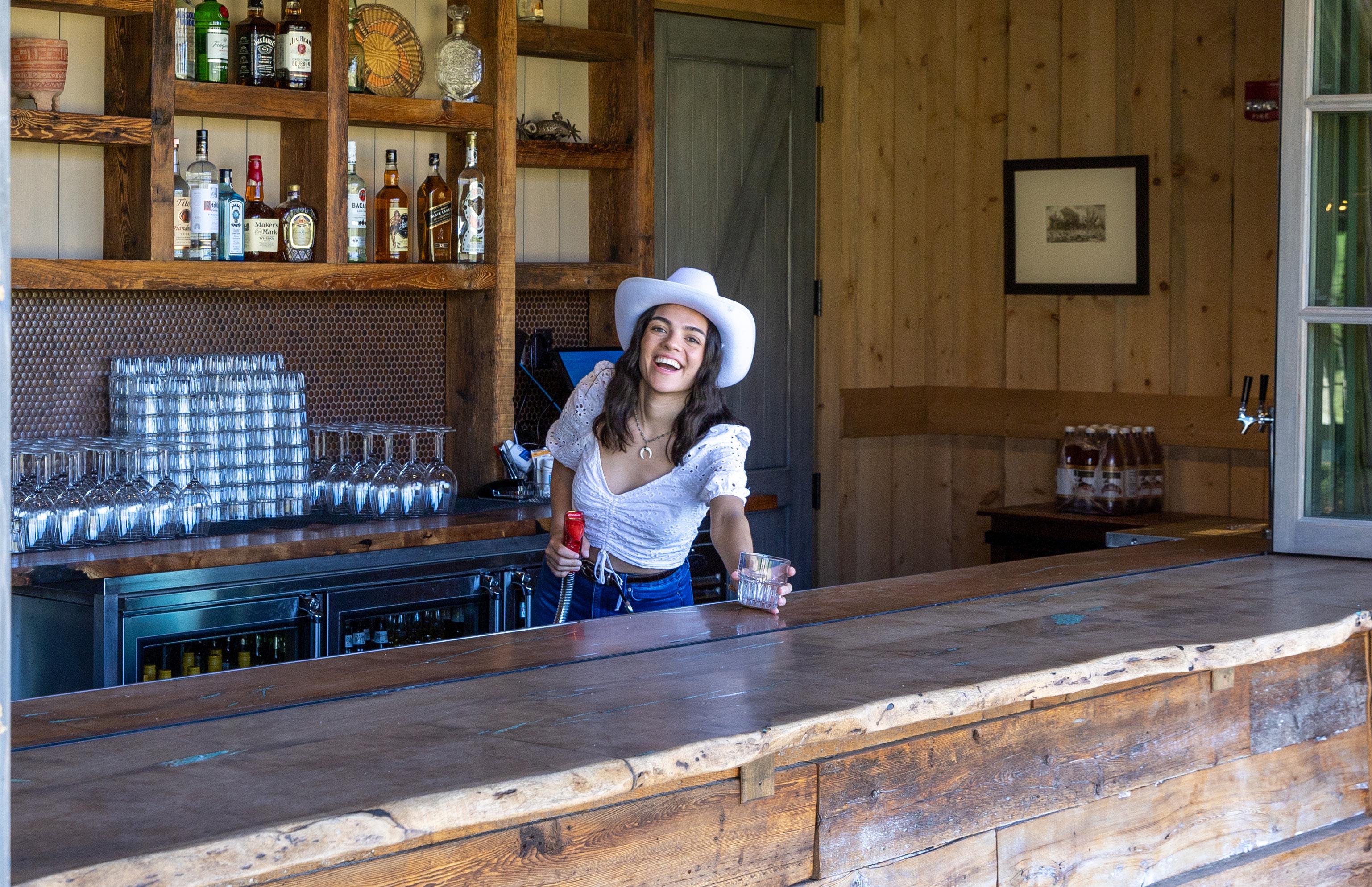 The pendant lights at the bar were custom made from retired yokes on the property.