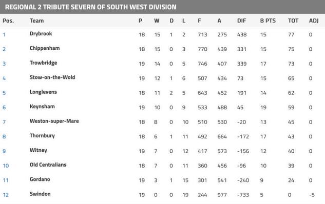 Back to who’s up and who’s down: 4 down is of course worst-case scenario. At the moment it looks like it will be the bottom two clubs, almost certainly Swindon and Gordano. Gordano are 16 points adrift and so with just 3 games left it is impossible for them to overtake us. That makes it fine if the magicians at the RFU keep it at 2 down.