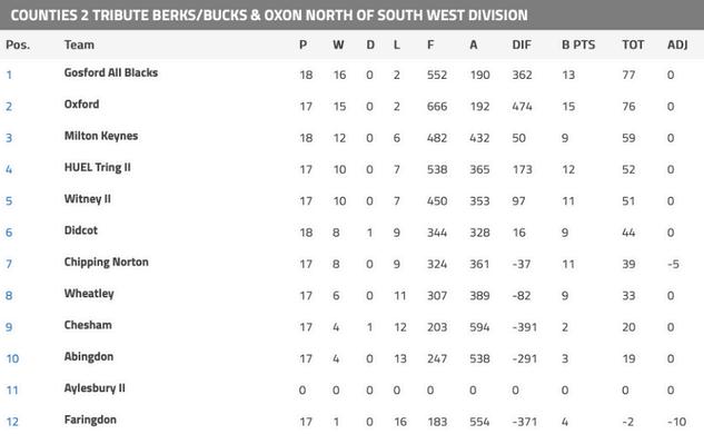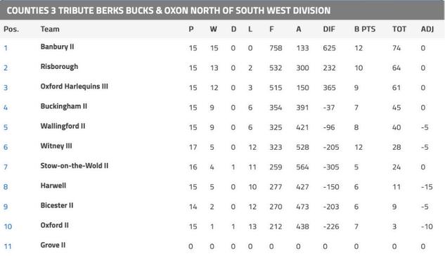 Stow currently lie just 4 points behind us with a game in hand, today against Oxford Harlequins III, currently up in 3rd who should be looking to move up to 2nd overtaking Risborough.