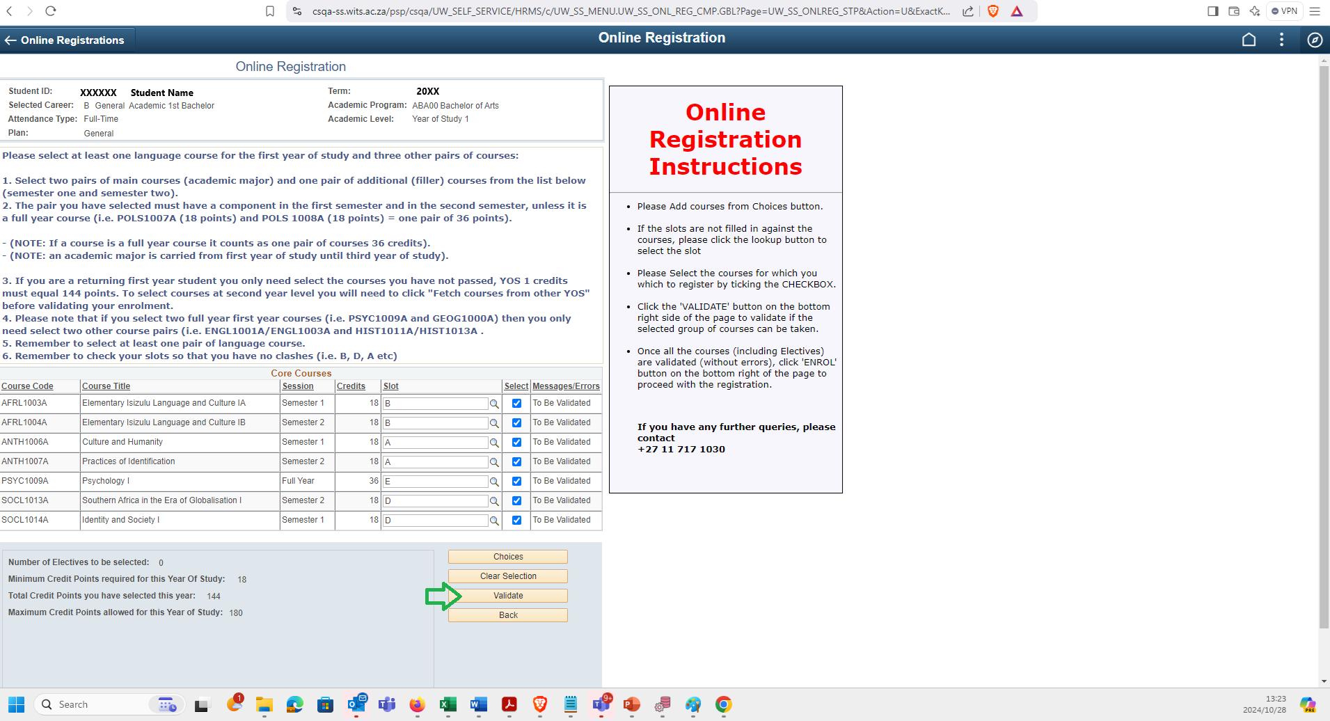 • You are required to provide proof of identification, such as your ID document, passport, or driver’s license. If you get any errors during the registration process, please follow the online instructions to rectify, or contact the Student Call Centre 011 717 1888.