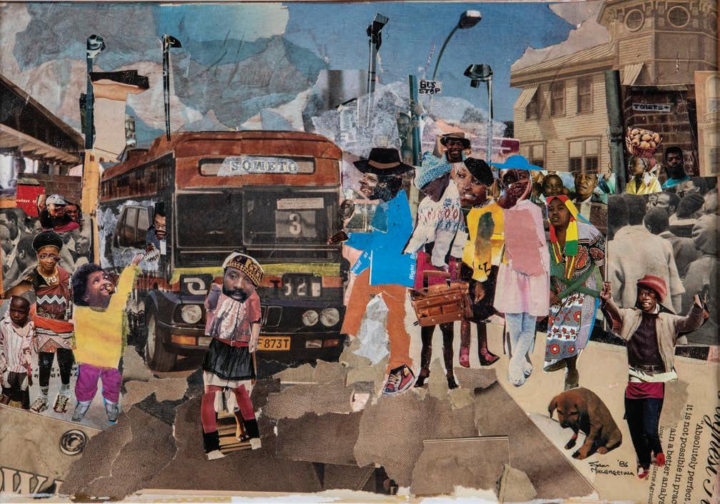 Sam Nhlengethwa, No title (Sowetan bus). 1985. Collage on paper. 38.2 x 49.8 cm. Presented in 2000 by Gertrude Posel to Wits Art Museum