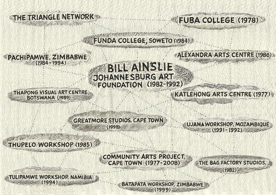 The JAF and the Thupelo Workshops were nodes that connected South African and international artists. Bill Ainslie and his collaborators came together to share ideas and learn from one another, and between 1982 and 1992 a strong network of South African and international artists affiliated to the JAF developed. Artists like Bongi Dhlomo, Kagiso Pat Mautloa and David Koloane were inspired to create community art centres and arts organisations across the country. Each centre adapted to the needs of its community, and artists travelled between them, building a network of creativity and activism. They shared facilitators, resources, and workshops, spreading opportunities for learning and expression far and wide. The diagram below shows some of these organisations.
