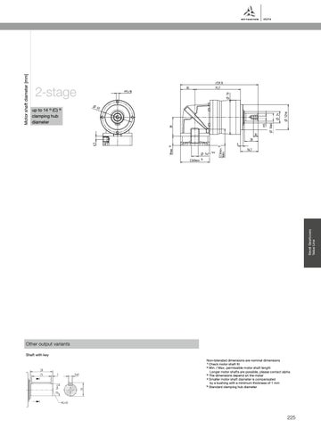 Other output variants Shaft with key Non-tolerated dimensions are nominal dimensions 1) Check motor shaft fit 2) Min. / Max. permissible motor shaft length Longer motor shafts are possible, please contact alpha 3) The dimensions depend on the motor 4) Smaller motor shaft diameter is compensated by a bushing with a minimum thickness of 1 mm 5) Standard clamping hub diameter