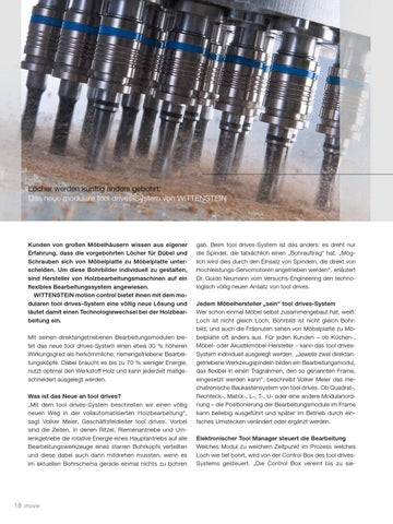 Kunden von großen Möbelhäusern wissen aus eigener Erfahrung, dass die vorgebohrten Löcher für Dübel und Schrauben sich von Möbelplatte zu Möbelplatte unterscheiden. Um diese Bohrbilder individuell zu gestalten, sind Hersteller von Holzbearbeitungsmaschinen auf ein flexibles Bearbeitungssystem angewiesen. WITTENSTEIN motion control bietet ihnen mit dem modularen tool drives-System eine völlig neue Lösung und läutet damit einen Technologiewechsel bei der Holzbearbeitung ein. Mit seinen direktangetriebenen Bearbeitungsmodulen bietet das neue tool drives-System einen etwa 30 % höheren Wirkungsgrad als herkömmliche, riemengetriebene Bearbeitungsköpfe. Dabei braucht es bis zu 70 % weniger Energie, nutzt optimal den Werkstoff Holz und kann jederzeit maßgeschneidert ausgelegt werden. Was ist das Neue an tool drives? „Mit dem tool drives-System beschreiten wir einen völlig neuen Weg in der vollautomatisierten Holzbearbeitung“, sagt Volker Meier, Geschäftsfeldleiter tool drives. Vorbei sind die Zeiten, in denen Ritzel, Riemenantriebe und Umlenkgetriebe die rotative Energie eines Hauptantriebs auf alle Bearbeitungswerkzeuge eines starren Bohrkopfs verteilten und diese dabei auch dann mitdrehen mussten, wenn es im aktuellen Bohrschema gerade einmal nichts zu bohren
