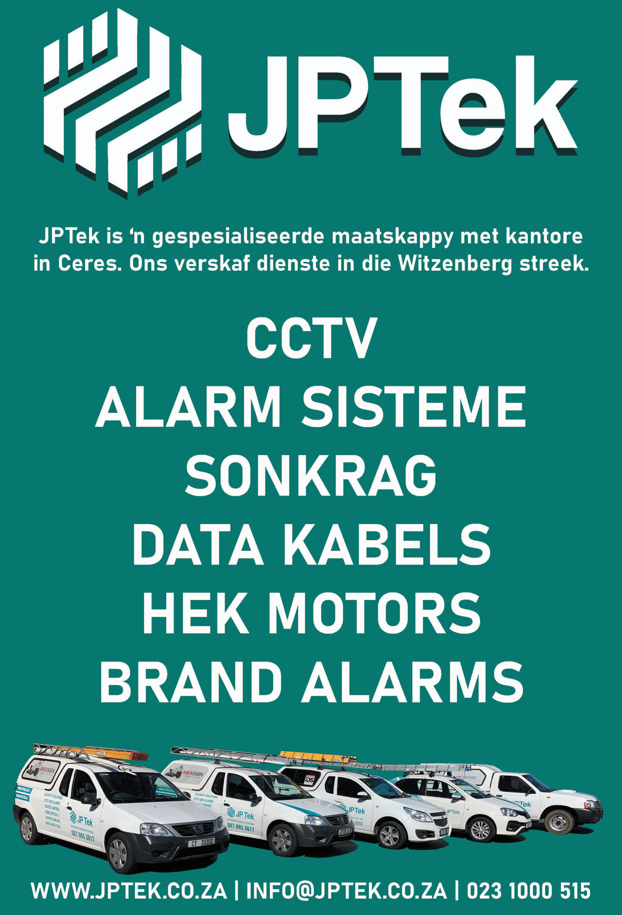 14 JULY 2023 l WITZENBERG HERALD l 3 SKAKEL ONS VIR ALLE HEK MOTORS | ALARMS | CCTV INSTALLASIES We offer: ·Consulting Services·Maintenance ·Access Control·Audio and Visual ·Structured Cabling·Wireless Networking ·Alarm Systems·Gate motors ·IP Based CCTV Systems ·Fibre Optic Installations ·Analytic Based Alert Notification Systems ·Analogue Based CCTV Systems ·Integrated Security Systems BACKUP POWER SOLUTIONS call us for: inverters batteries solar panels www.jptek.africa 023 1000 515 info@jptek.co.za