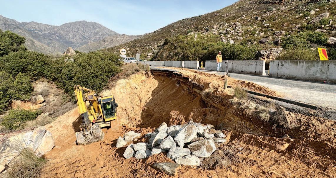 Herstelwerk aan die pad het verlede week begin en is die WesKaap departement van infrastruktuur besig om die groot gat met groot klippe op te vul. Daarna sal dit met beton opgevul word om die bergwand te stut. Die padoppervlakte wat gekraak het sal ook vervang en oorgeteer word voordat die pad middel Agustus weer oopgestel word vir verkeer.