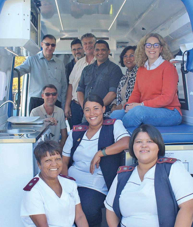 replacement mobile clinics. BACK: Anthonie Janse van Rensburg, Jannie Voges, Izak Wessels, Mark Ismail, dr. Lizette Phillips and Minister Mireille Wenger. FRONT: Corne Engelbrecht, sr. Samantha Miggels, sr. Elsabe Bailey (left) and sr. Reone Strydom (right).