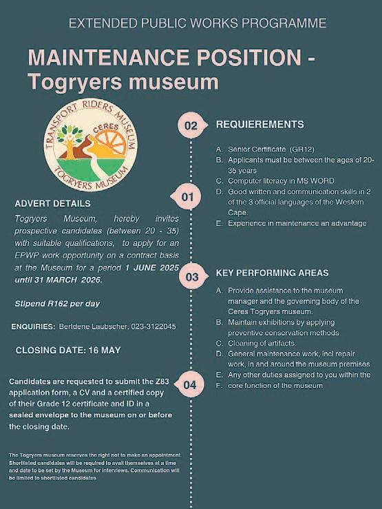 Die Witzenberg Herald word uitgegee vir die eienaars, Snyman, Voortrekkerstraat 17D, Ceres en gedruk deur Novus Print, Lynxstraat 5, Paarden Eiland. Geen advertensie/redaksionele materiaal mag sonder die verlof van die eienaars volgens Art. 12 (7) Wet op Outeursreg 1978 gereproduseer word nie.