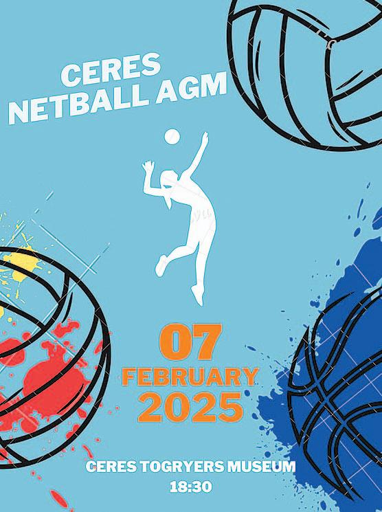 CERES netblaklub hou hul algemene jaarvergadering op 7 Februarie om 18:30 in die Ceres Togryers museumsaal. Skakel Marilize Theron by 073-318-7638 vir navrae en/of bywoning bevestiging of stuur ‘n e-pos na ceres netball@gmail.com.