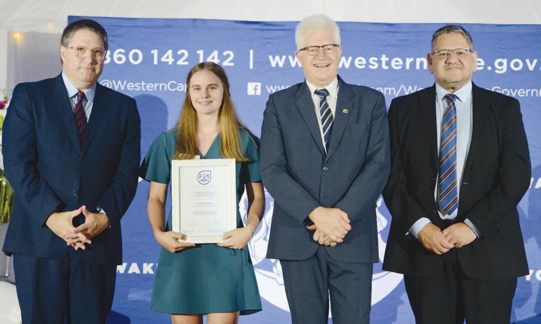 Hofmeyr se Dux-leerder van 2024, Jo-Marie du Toit, het verlede week twee toekennings ontvang tydens die Wes-Kaap nasionale senior sertifikaat toekenningsgeleentheid wat in Kaapstad gehou is. Jo-Marie het die hoogste punte in rekeningkunde in die Wes-Kaap behaal en het ook die vierde beste algehele gemiddeld van alle kandidate in die Wes-Kaap behaal. VLNR: Minister van Onderwys David Maynier, Jo-Marie du Toit, premier Alan Winde en Brent Walters (hoof van WKOD).