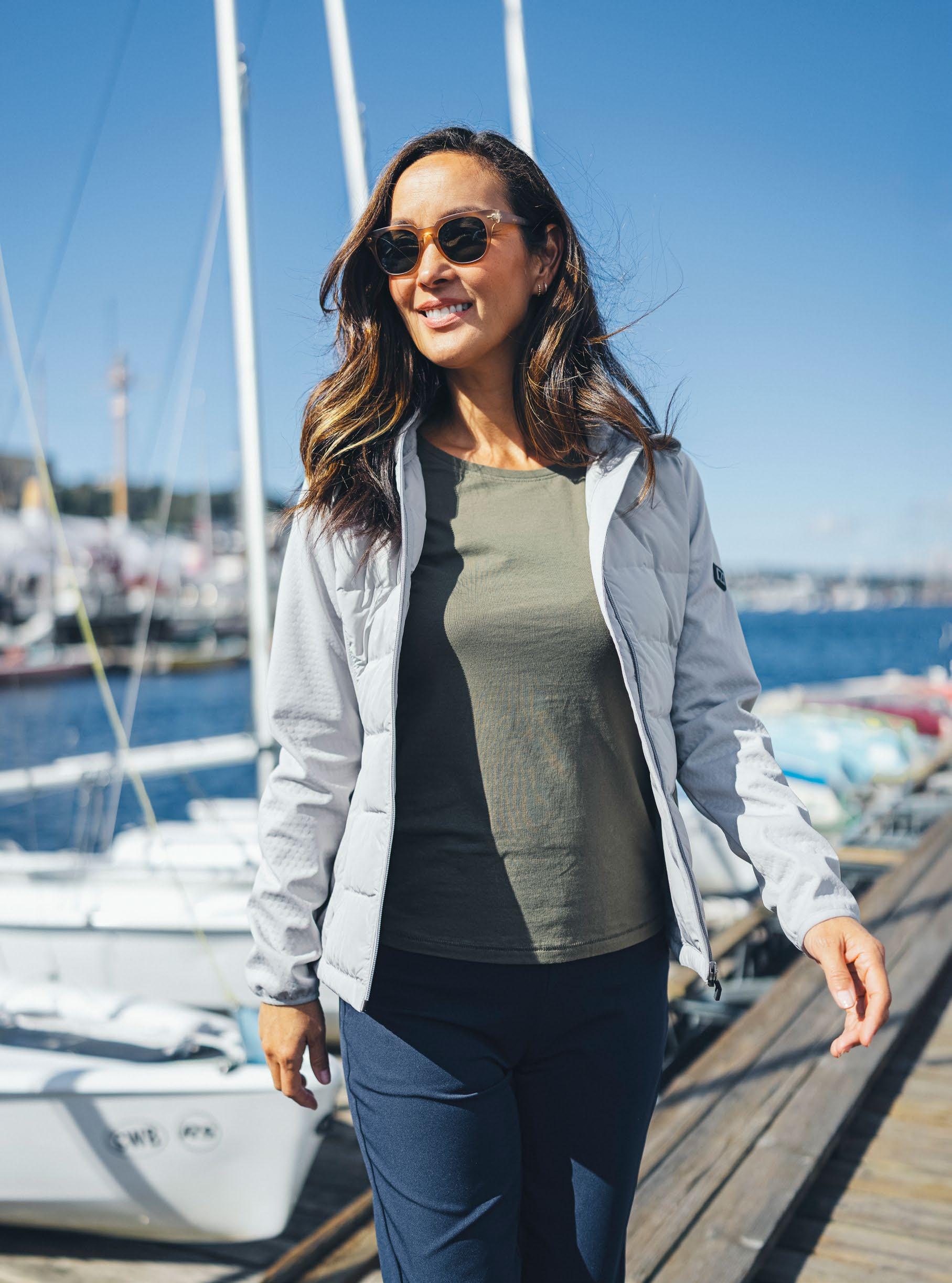 The perfect vest for in between season hikes or underneath a coat as a warming layer. Ozette is insulated with premium Primaloft® Black Eco padding and the fabric is woven from 100% recycled nylon for warmth and lightness. Two zip pockets at the front. Vertical quilted lines for a flattering fit. This vest is super lightweight, making it easy for travelling and layering. YKK® zippers.