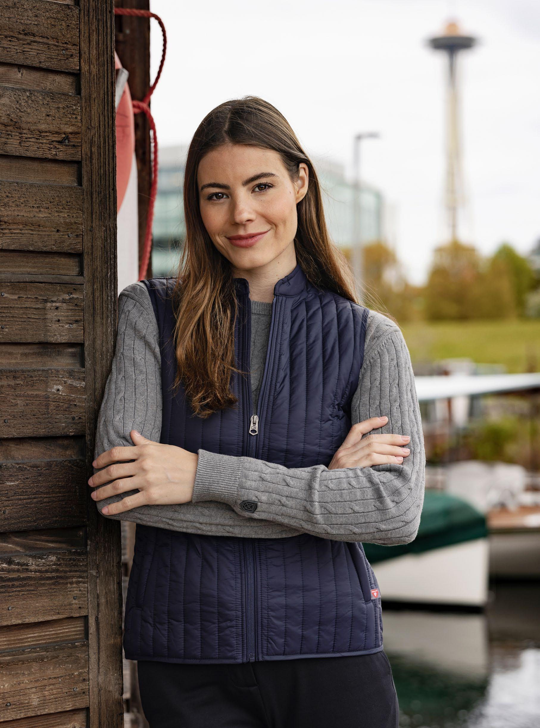 Oak Harbor Jacket & Vest embrace the perfect balance of warmth, style, and eco-consciousness. The stretch-polyester sleeves and sides offer complete comfort. The quilted front and back panels feature insulation using Sustans® padding made from renewable fibers by DuPont™ Sorona®. The ladies' jacket boasts a hood, while the men's version has a collar. Both come with full zips and auto-lock zip-pullers on the front and pockets. These versatile pieces can be worn solo for dry conditions or layered under a rain protective shell for extra warmth. The vest is a great addition, perfect for layering over an Oakville sweater or the Traverse