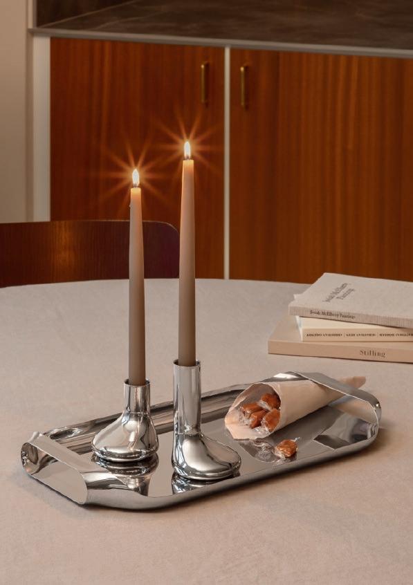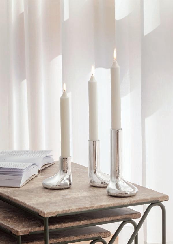 Mellow lysestagerne leger med kontraster. Stålens rå styrke møder bløde, næsten flydende former, inspireret af smeltet stearin. Lyset skaber et levende spil af reflektioner på de blanke, asymmetriske overflader. De står flot alene, men fremstår ekstra elegante i grupper med varierende højder.