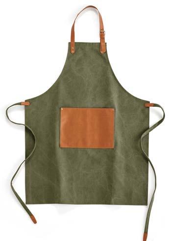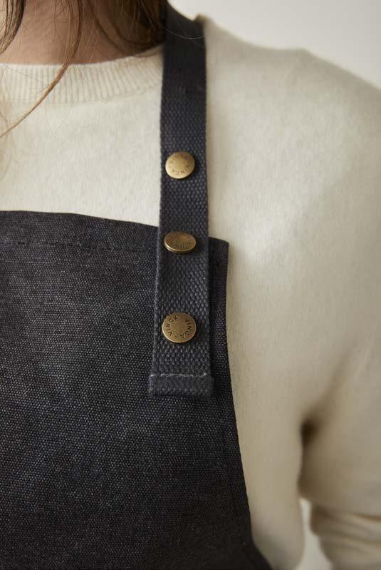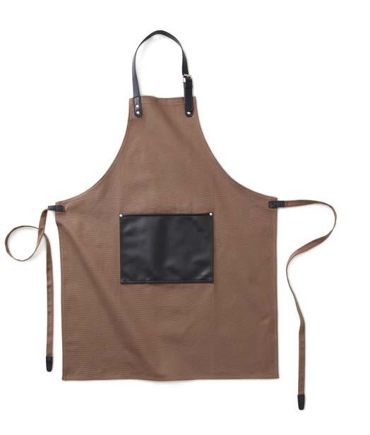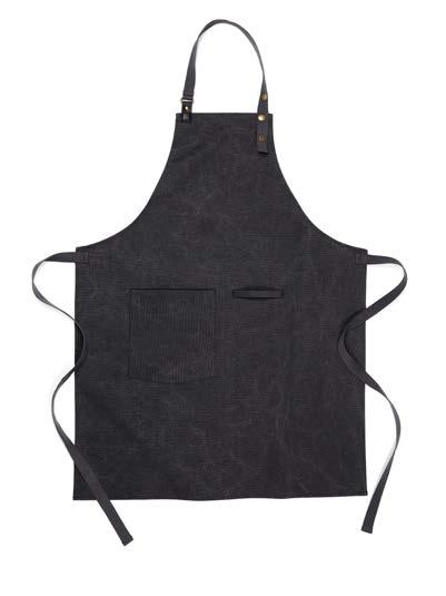 Stilrent og klassisk forkle i tykk bomullskanvas (400 gsm) med diskrete detaljer i veganlær. Regulerbar spenne oppe, og en stor lomme foran. Et forkle med lang varighet som blir finere med tiden.