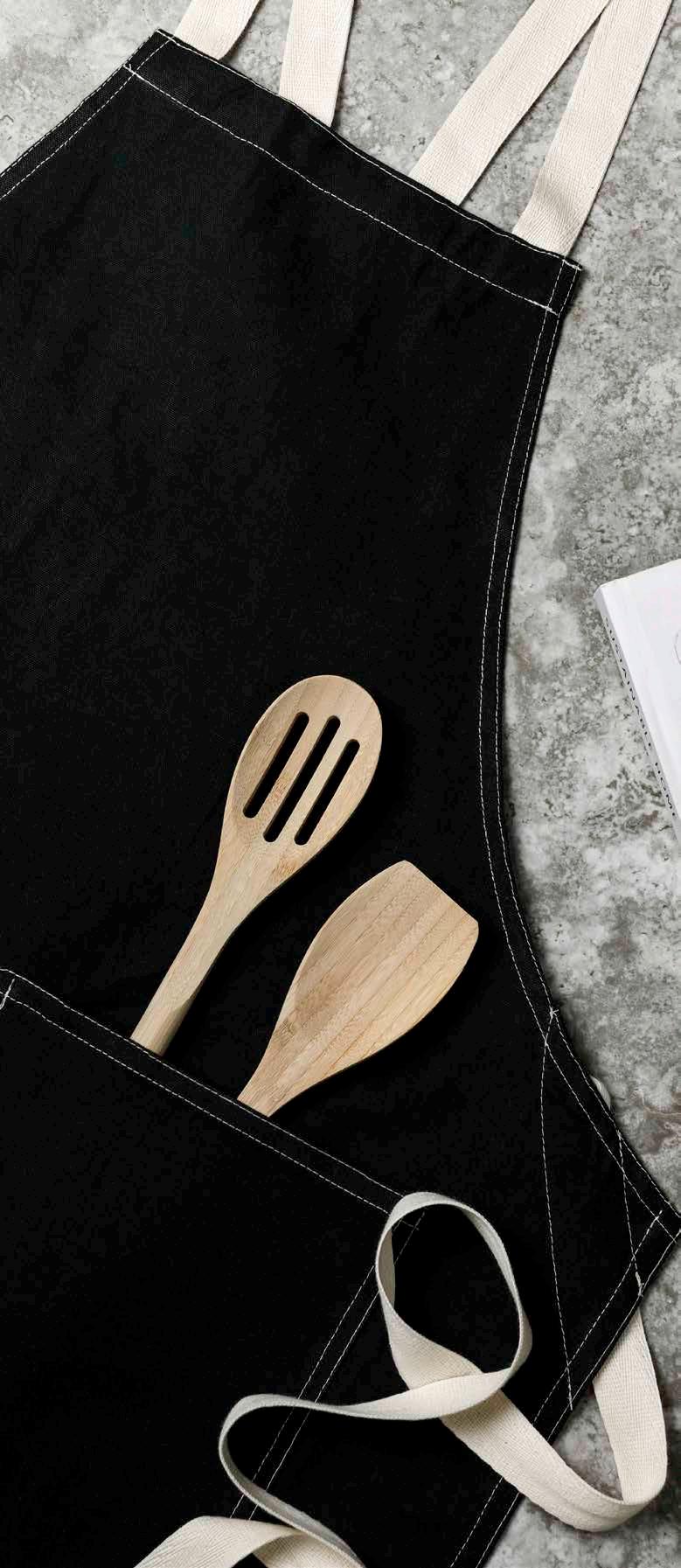 Forkle laget av 70 % sertifisert resirkulert bomull fra leverandørens bomullsavfall. Fibre som vanligvis betraktes som ubrukelige, vil med riktig produksjonsprosess oppnå de ønskede egenskapene. Dette forkleet er ekstra bredt for å gi maksimal beskyttelse. To store frontlommer og en løkke for oppheng av kjøkkenutstyr eller et kjøkkenhåndkle.