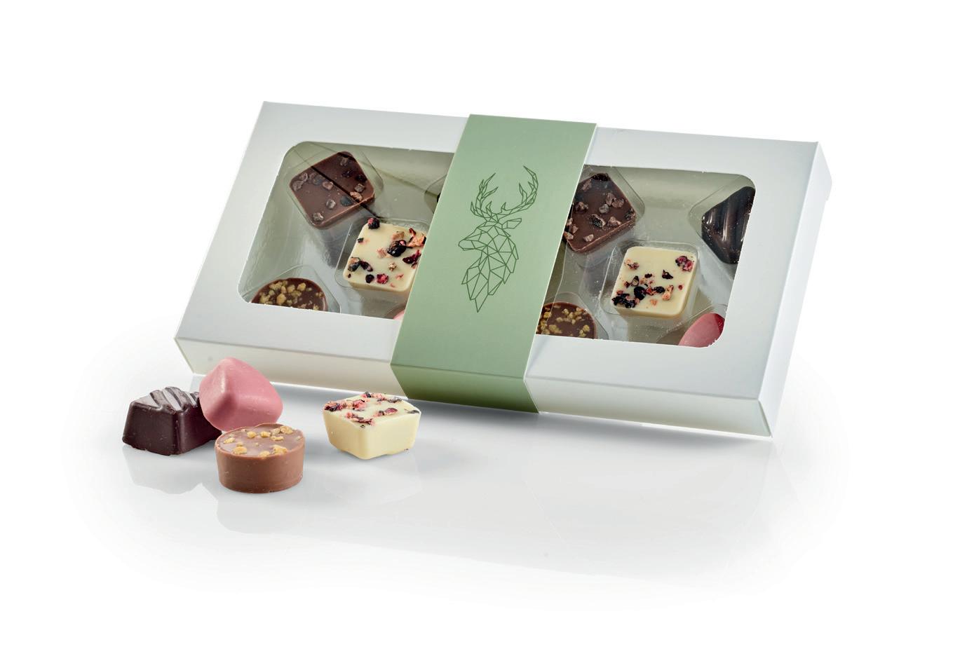 4 stk. chokoladekugler, 55 g. Pakket i kartonæske m/træuld
