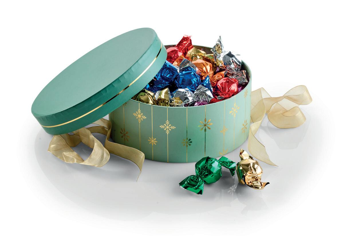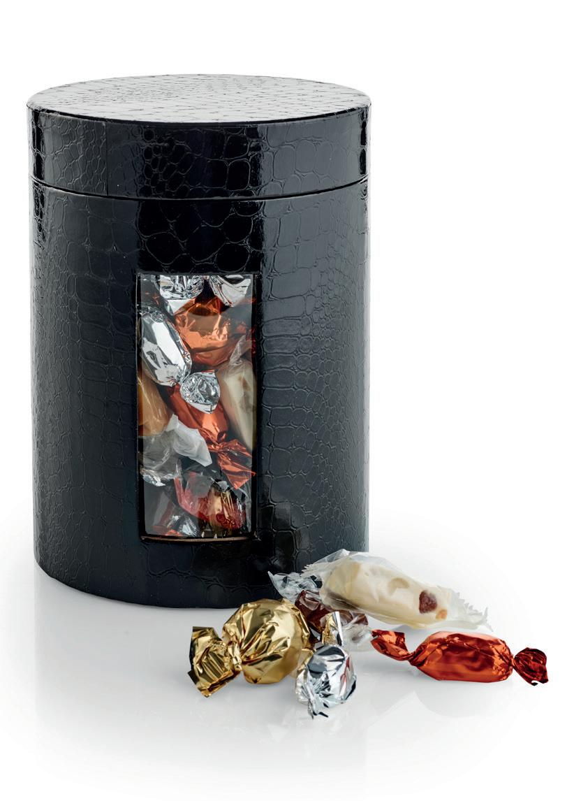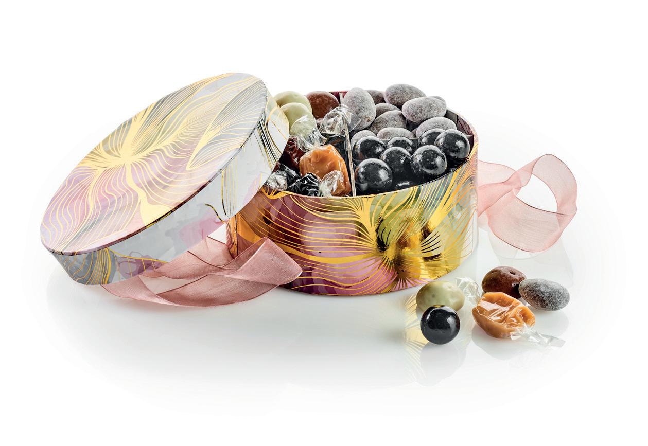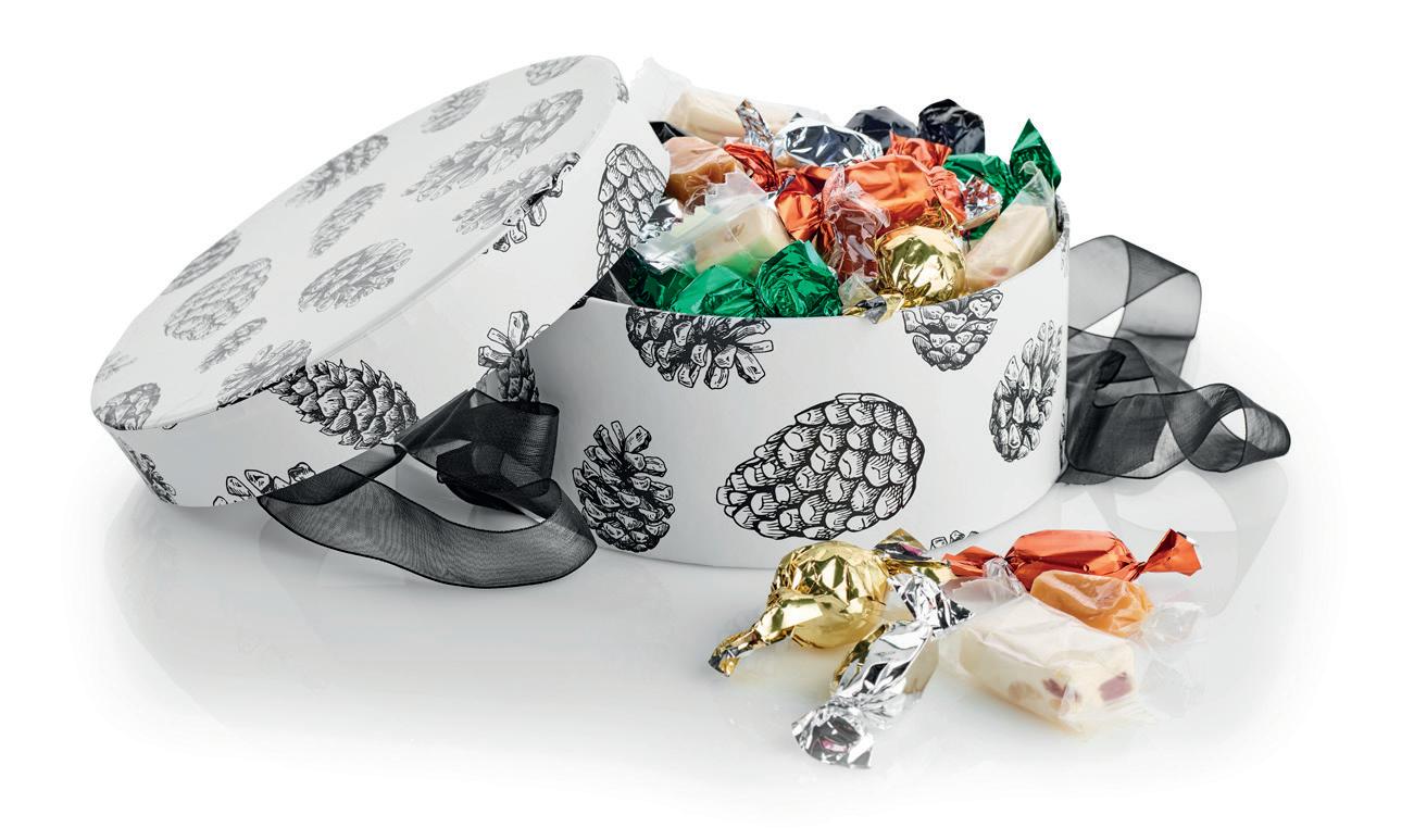 Guld rund hatteæske m/vindue Julemix (chokolade, Karameller & fransk nougat), 1000 g.