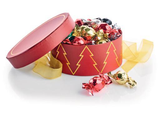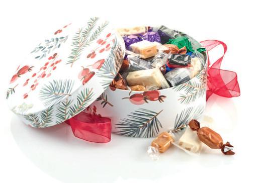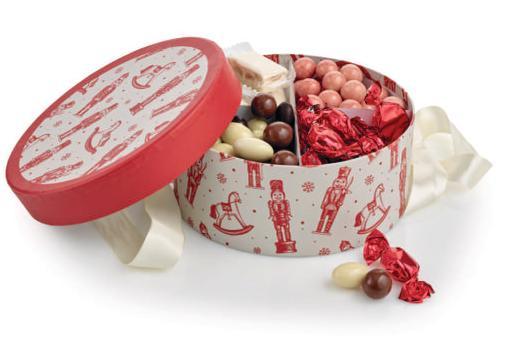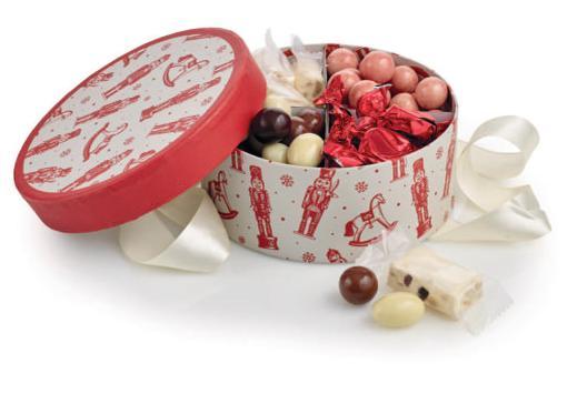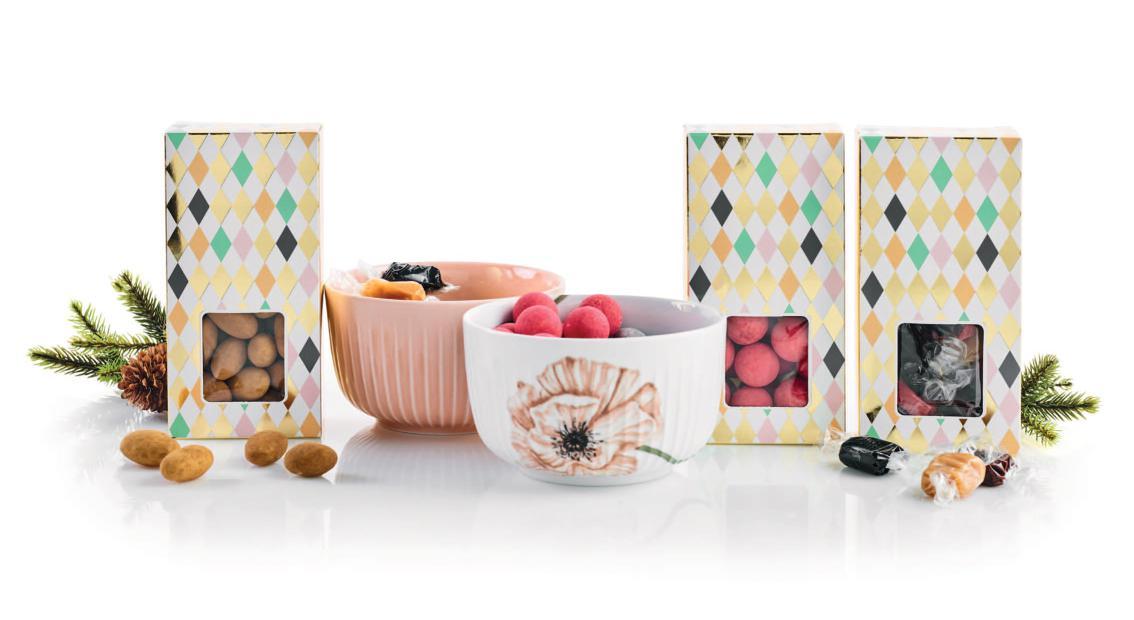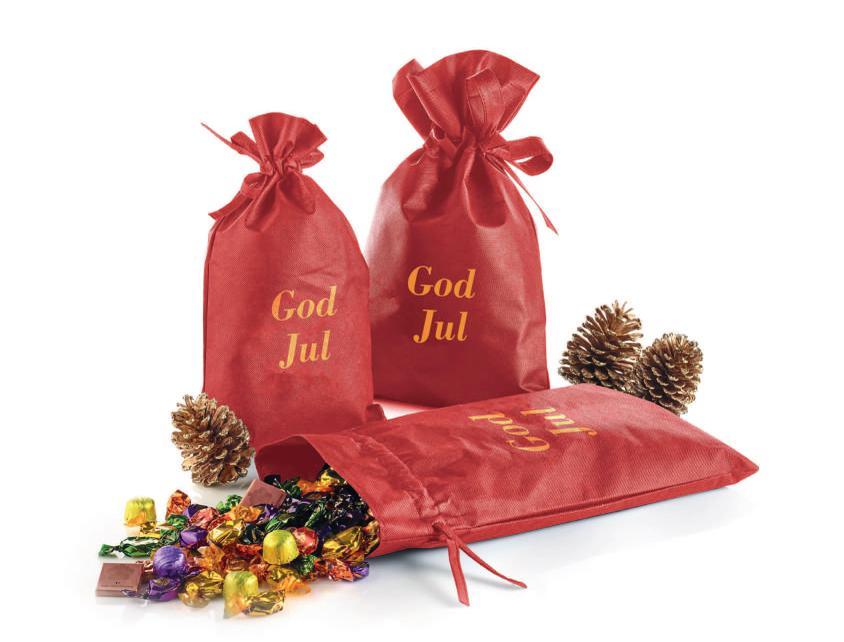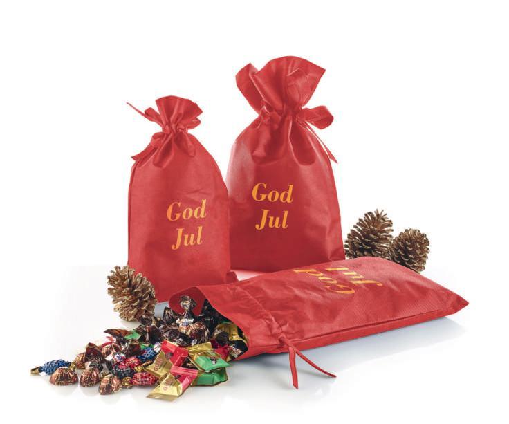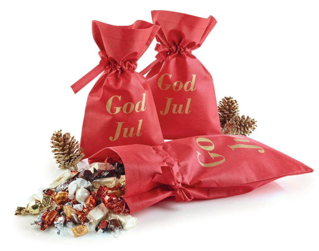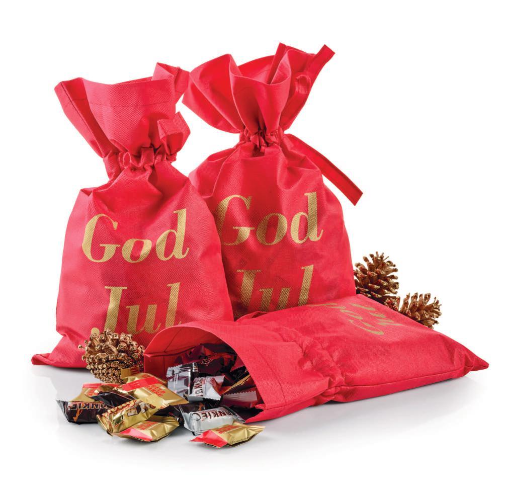 Rød stofpose - guldtryk “God Jul” med Toms Festival Mix 2900 g.