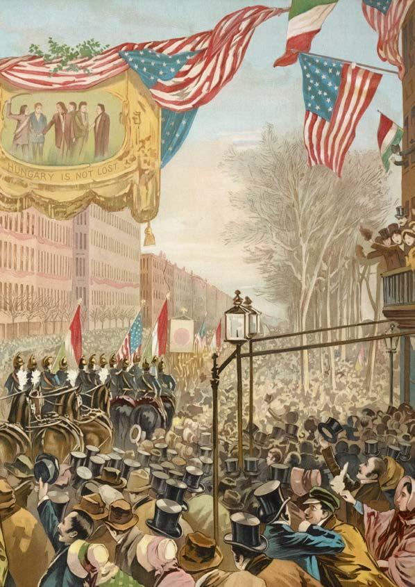 I'r dde: Pan deithiodd Kossuth ar hyd Broadway "Louis Kossuth, y gwladgarwr mawr o Hwngari, yn cael derbyniad gwresog gan 100,000 o Americaniaid ar ôl cyrraedd Efrog Newydd ar 6 Rhagfyr, 1851." Roedd yr ymweliad yn rhan o'i daith i UDA a Phrydain yn 1851 lle'r oedd "Mania Kossuth" wedi gafael.
