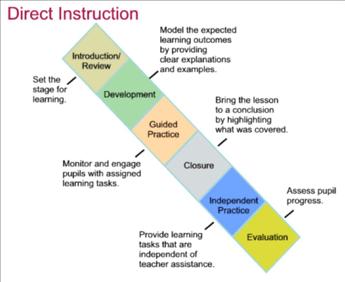 Gall gwersi ganolbwyntio ar yr hyn y mae angen i’r myfyrwyr ei ddysgu yn hytrach na chynllunio gweithgareddau creadigol lle y bydd y dysgu bron yn eilradd i’r dasg. Rhoddir mwy o bwyslais ar ymarfer a dangos yr hyn a ddysgwyd a dealltwriaeth ohono, yn hytrach na threulio amser yn ceisio darganfod rhywbeth sydd wedi cymryd canrifoedd i feddyliau gorau’r gorffennol i’w ddarganfod