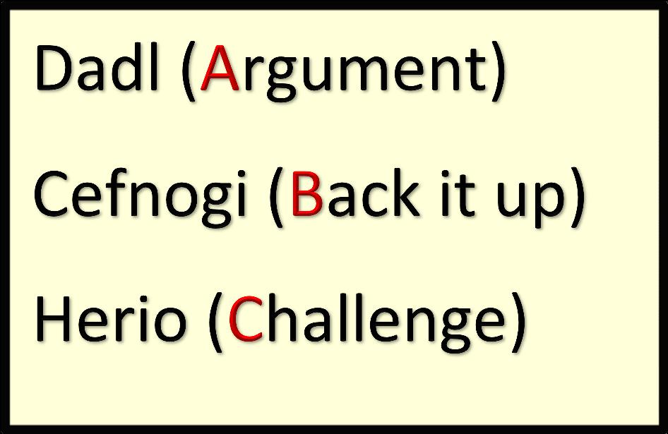 Mae athrawon yn defnyddio fframiau ysgrifennu gwych gyda'u myfyrwyr ar gyfer ymatebion i gwestiynau AA2. Yn aml, daw'r rhain ar ffurf acronymau fel PEEL (Point, Explain, Evaluate and Link back to the question) neu fy hoff un newydd: ABCD (Answer it, Back it up, Challenge it and Decide). Y syniad yw y bydd ymateb rhagorol yn archwilio sawl mater, nid dim ond un, ar gyfer un cwestiwn yn y ffordd hon. Mae'r fframiau hyn yn annog myfyrwyr i wneud mwy na disgrifio yn unig. Mae'n eu hannog i wneud gwaith gwerthuso, sy'n golygu pwyso a mesur cryfderau a gwendidau'r pwyntiau a'r dadleuon a gyflwynir. Wrth gwrs, nid oes angen ‘ffrâm’ o'r fath ar lawer o fyfyrwyr – byddant yn deall yr her sy'n gysylltiedig â gwerthuso yn reddfol ac yn barod amdani!