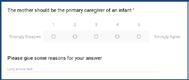 Beth wnaethon ni Mae’r ddadl ‘mam fel rhoddwr gofal sylfaenol baban’ eisoes wedi codi trafodaethau diddorol pan edrychom arno fel rhan o dystiolaeth glasurol Bowlby (1944). Cyn i’r gyfres o wersi ddechrau, anfonwyd dolen i arolwg ar-lein i fyfyrwyr a grëwyd gan ddefnyddio Google Forms (er y gellir cynhyrchu pethau tebyg gael ar SurveyMonkey a llwyfannau eraill). Roeddem wedi dewis 4 rhan o’r ddadl i ganolbwyntio arnynt a strwythuro’r gwersi o’u cwmpas (rôl y fam, rôl y tad, yr effaith ar ofal plant a goblygiadau economaidd a chymdeithasol) ac roedd y cwestiynau yn canolbwyntio ar y 4 maes yma. Gofynnwyd i’r myfyrwyr raddio eu barn ar raddfa Likert ac yna egluro eu hateb (Ffigur 1). Casglwyd yr ymatebion yn ddienw.