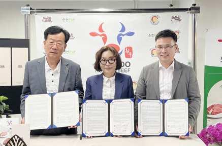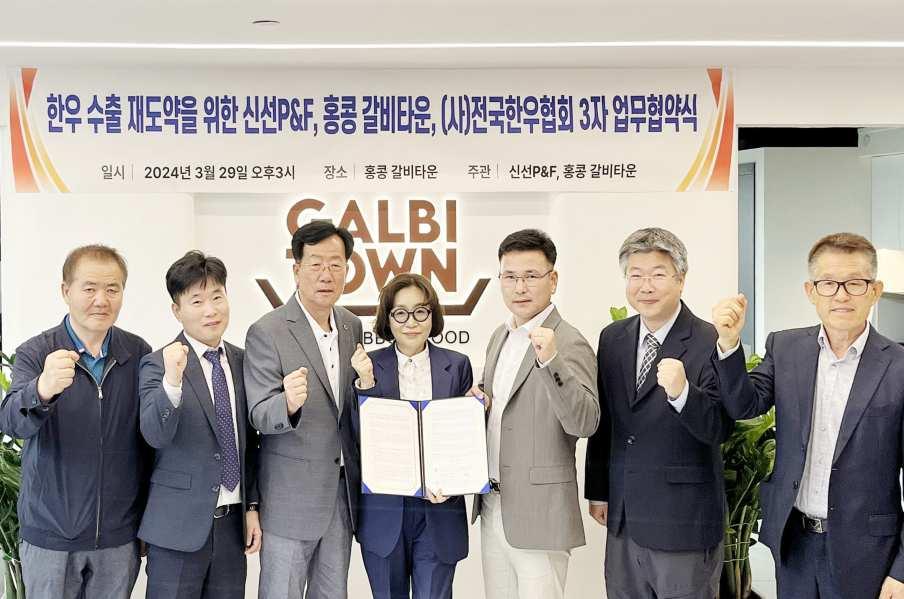 지난달 3월 29일 한우 수출 재도약을 위한 신선P&F, 홍콩 갈비타운, (사)전국한우협회 3자 업무혁약식이 개 최됐다. 이날 업무협약식에서는 홍콩에서 한우의 우수성을 알