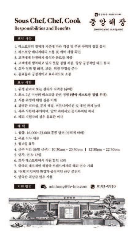 홍콩 언론에서 평가하는 인기의 비결은? 실제로 요즘 홍콩 사람들을 만나 보면 ‘흑백요리사’ 얘기를 많 이 한다. 홍콩 이웃들과 좋은 대화거리가 생긴 것이다. ‘흑백요 리사’가 인기를 끌며 현지 언론들도 관련 기사들을 쏟아내기 시 작했다. ‘중식여신’이란 별명으로 동파육 만두를 선보인 박은영 셰프가 홍콩 센트럴의 그랜드 머제스틱 쓰촨에서 부수석 셰프 로 일하고 있다는 기사가 언론사 몇 곳을 통해 보도되었다. 또한 한국의 연예계 소식을 발 빠르게 전하는 K데일리 (thekdaily.com)는 9월 27일 ‘흑백요리사 왜 이렇게 재미있 지?’라는 제목의 기사를 게재했다. 우선 다른 요리 서바이벌 프 로그램과의 차별성을 ‘계급 전쟁’으로 규정하였다. 재야의 고수 들과 명성이 자자한 요리사들이 계급장을 떼고 맞붙는 승부의 세계가 독특하다는 것이다. 그리고 각기 다른 배경의 요리사들( 학교 급식 요리사, 요리 유튜버, 만화로 배운 요리사 등)이 출연 하여 다양성을 더했고 방대한 스케일의 세트장, 서로 상반된 배 경을 가진 두 심사위원 간의 논쟁을 통한 결과 도출 등이 재미를 한껏 더한다고 소개했다. 아울러 “서로를 존중하는 분위기가 마 음에 든다. 참가자들은 오직 실력으로 승부하고 자신의 요리에 대해서만 집중한다. 막상 결과가 발표되면 진 사람은 축하를, 이 긴 사람은 위로하며 모두 웃으며 떠난다. 특히 경력이 대단한 셰 프들도 패배를 받아들이며 불만을 표하지 않고, 오히려 상대를 격려하고 떠나는 분위기가 정말 따뜻하다”며 글을 마무리했다. 프로그램의 인기가 한식붐으로 이어지길 ‘흑백요리사’의 담당 PD는 이 프로그램의 제작 취지가 세계 인들에게 다양한 한식을 소개함과 동시에 우리나라의 요식업 에 활기를 넣고자 함이라 했다. 그렇다면 홍콩에서도 ‘흑백요리 사’의 인기를 통해 한식 및 한식당들이 더욱더 현지인들에게 사 랑받았으면 하는 바람이다. 한식당들은 장사가 잘되어 좋고, 우