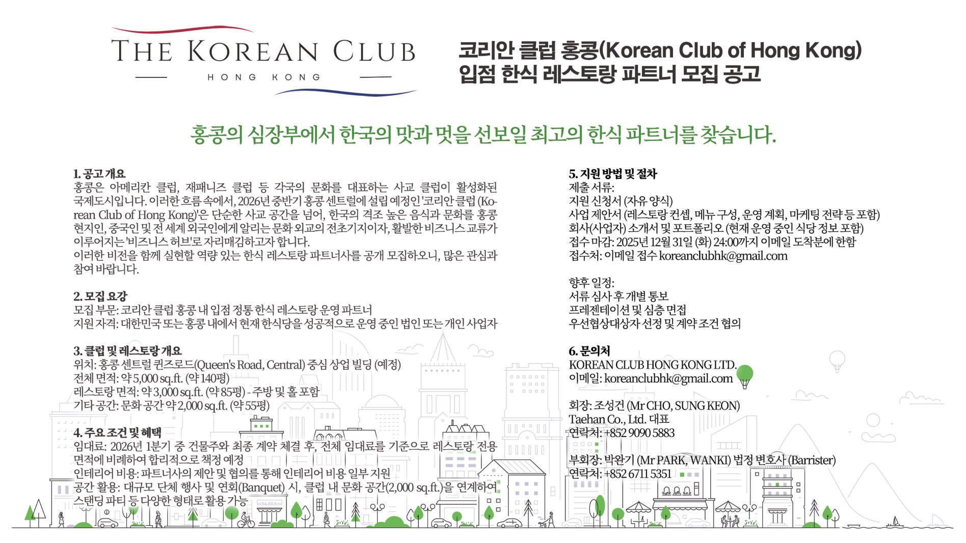 *2025년 11월 초 : 대한민국 및 홍콩 요식업체 대상 “코리안클 럽 홍콩 회관에 입주할 파트너 업체 공모” 홍보.