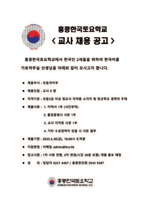 역사회의 발전과 아이들의 성장에 큰 기여를 하고 있다” 고 강조했다. 홍콩한국토요학교는 앞으로도 다양한 교육 프로그램