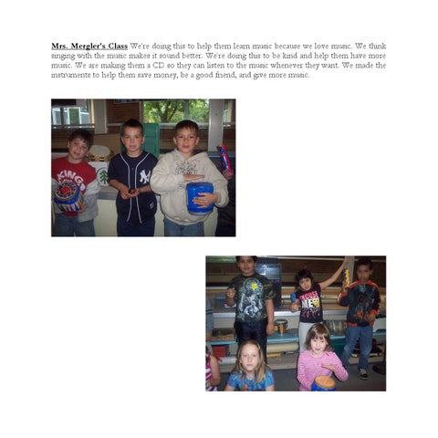 Mrs. Mergler's Class We're doing this to help them learn music because we love music. We think singing with the music makes it sound better. We're doing this to be kind and help them have more music. We are making them a CD so they can listen to the music whenever they want. We made the instruments to help them save money, be a good friend, and give more music.