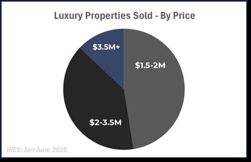 Luxury property sales between $1 5M and $2 0M surged dramatically following 2020, peaking in 2022 with 190 homes sold over three times the volume seen in pre-COVID 2019 Although sales cooled in 2023, the market rebounded in 2024 and remains elevated above prepandemic norms in 2025 with 132 homes sold year-to-date Through mid-year we’ve seen a 17 3% decrease in market activity in this price range, the only price range to dip so far in 2025