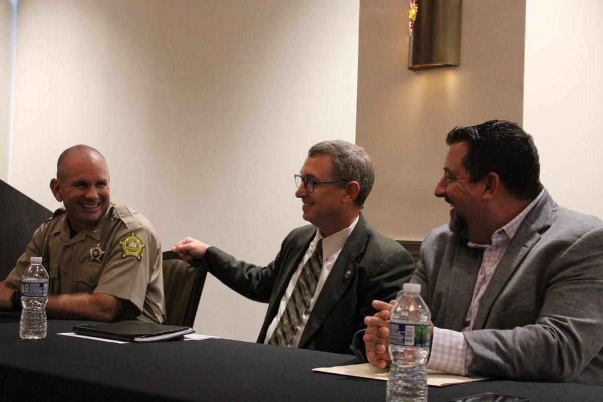 laugh while talking before speaking at the Department of Society, Culture, Crime and Justice’s law enforcement career panel on Sept. 28 in the Honors College and International Center.