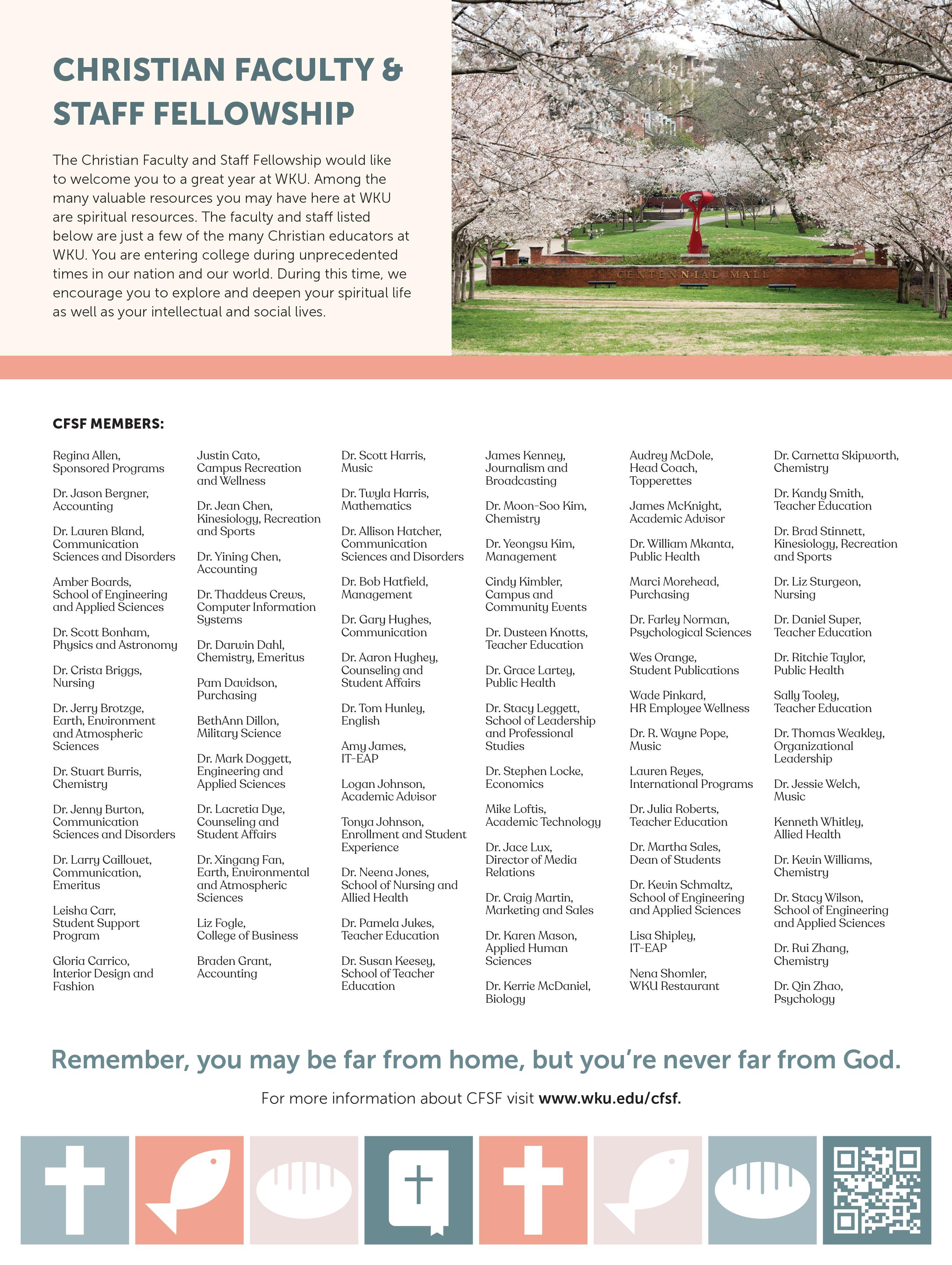 As an applied research university, WKU faculty engage in public service and research with practical applications. They work with communities, business, and industry to solve real-world problems. Best of all, we integrate students into the discovery process so you have the opportunity to gain valuable experiences both in and out of the classroom — providing you with skills needed for success after graduation. And because of our size and focus on students, our faculty will know your name, take a personal interest in your accomplishments and support you through graduation. We are here, ready to guide you during this important chapter in your life.