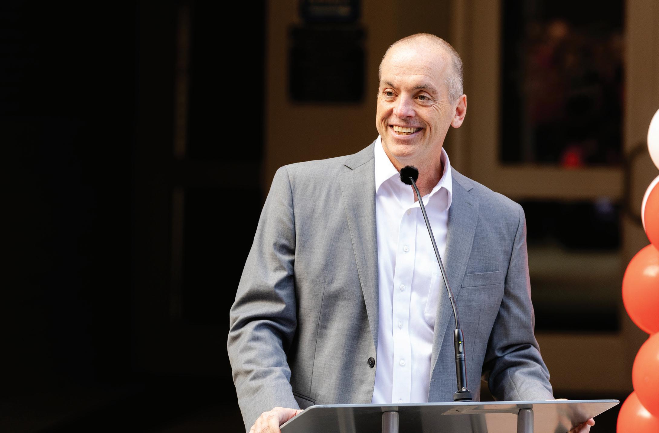 WKU Volleyball Head Coach Travis Hudson speaks at the unveiling event for his own statue, just outside of gate 2 at E.A. Diddle Arena on Saturday, Nov. 8, 2025. Last year, Hudson was inducted into the WKU Athletics Hall of Fame.