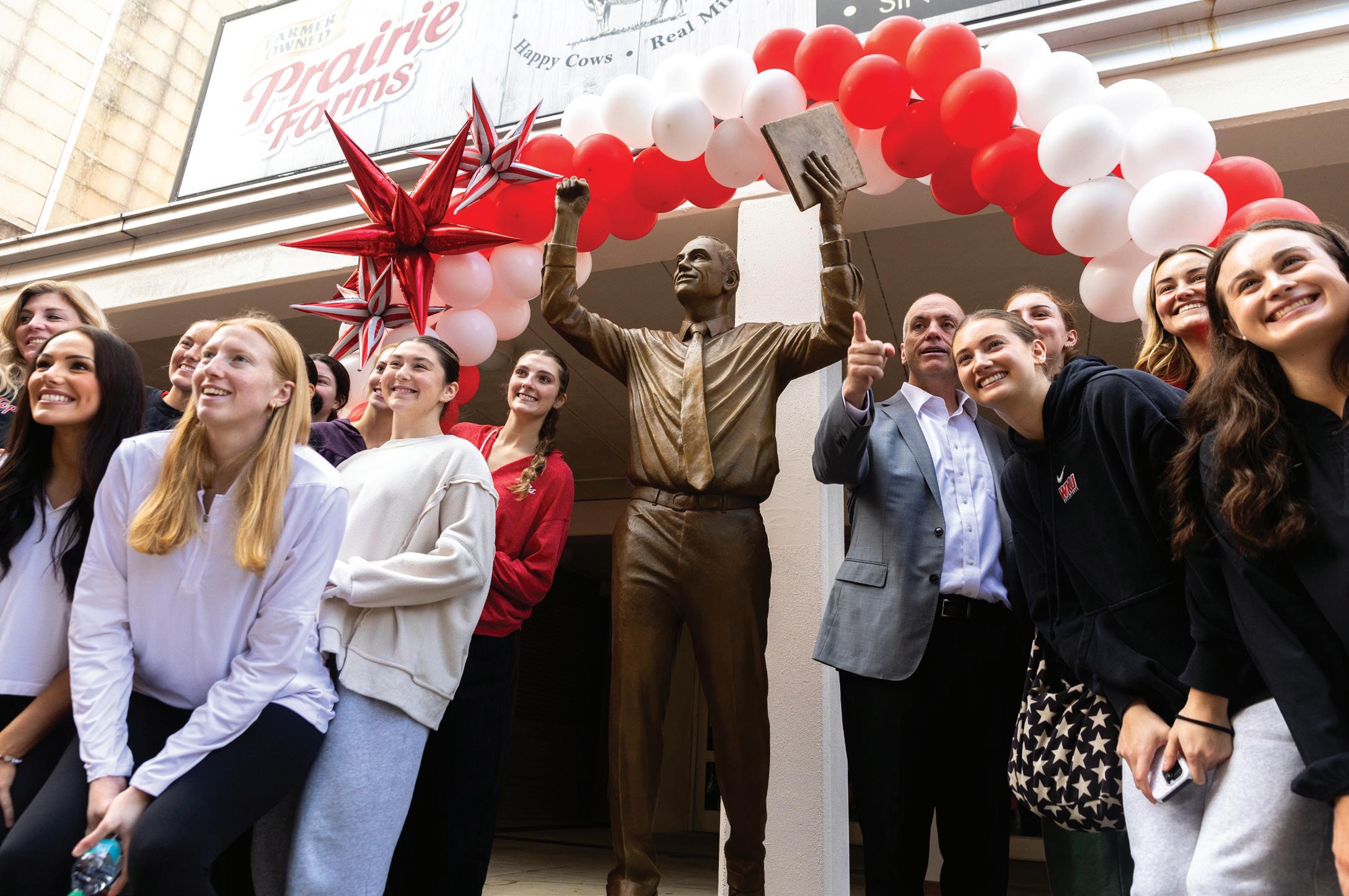 The WKU volleyball team poses for a group photo at the unveiling of head coach Travis Hudson’s statue outside of E.A. Diddle Arena on Saturday, Nov. 8, 2025.