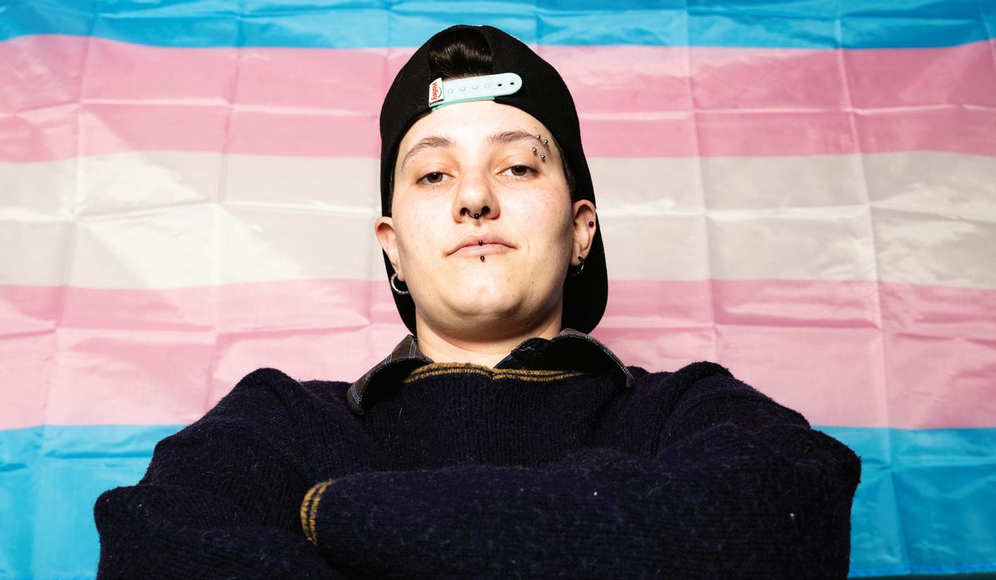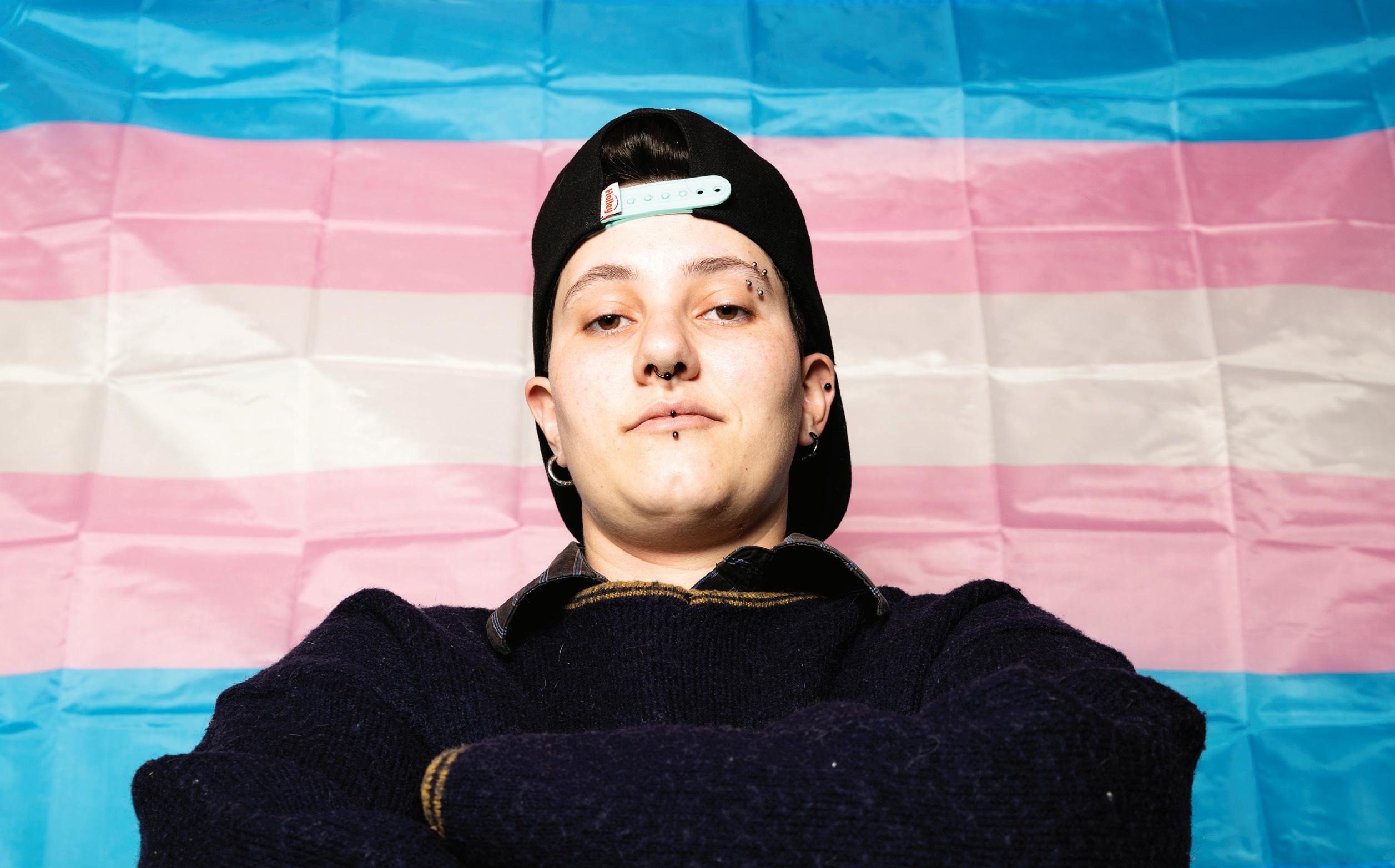 Jay Byrd, a transgender person, stands in the front of a transgender flag at Downing Student Union. Byrd was part of the Stonewall LLC, a living-learning community that supported LGBTQ+ students on campus.