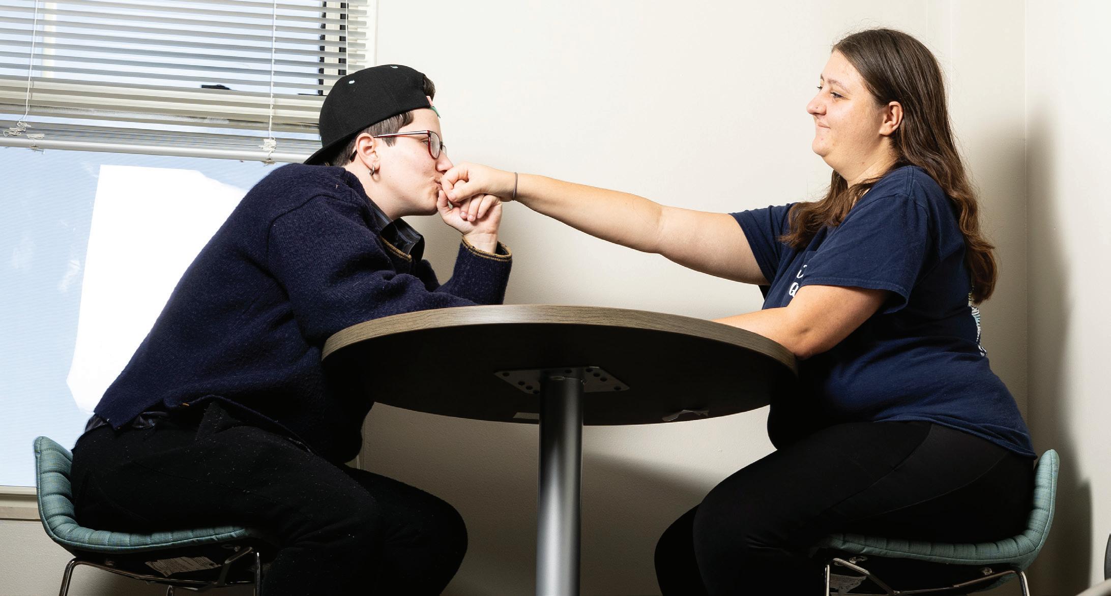 Jay Byrd gently kisses the hand of his wife, Cassandra Byrd at a table in the Meredith Hall study area, where they first met through the Stonewall LLC.