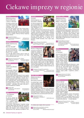 „Powrót Króla" Ziemia Leszczyńska ma się czym chwalić, wszak to z nią związane są dzieje królewskiego rodu Leszczyńskich. Wzorem miast o bogatej przeszłości historycznej, leszczynianie nawiązują do historii swojego miasta i pobliskiej Rydzyny, miasteczka kipiącego barokiem. Król Stanisław Leszczyński wyemigrował z Ry-dzyny w 1707 roku. Przebywał później w różnych krajach Europy, na dłużej zatrzymując się w Luneville i Zwei-brücken. „Powrót Króla” to impreza, która odbywa się w Lesznie i Rydzynie. Organizacja Turystyczna Leszno – Region 64-100 Leszno, ul. Karasia 15 biuro@leszno-region.pl tel. 65 529 82 34 www.leszno-region.pl