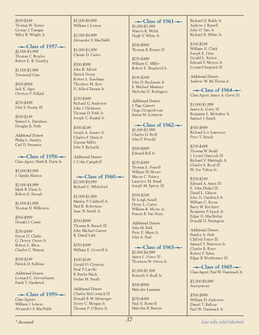 k Class of 1962k $1,000-$1,999 Charles D. Broll John P. Petzold $500-$999 Edward Bell Jr. $250-$499 Thomas L. Feazell William W. Moore Macon C. Putney Laurence M. Smail Joseph M. Spivey III $100-$249 W. Leigh Ansell Henry L. Carter William R. Moore Jr. Francis B. Van Nuys Additional Donors John M. Kirk Perry E. Mann Jr. John A. Paul