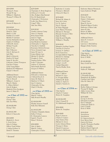 k Class of 1995k Class Agents: William M. Toles Kevin S. Webb $5,000-$9,999 Stacy Gould Van Goor $2,000-$4,999 Andrea K. Wahlquist $1,000-$1,999 J. Alexander Boone Kimmberly M. Bulkley Cynthia Icard Oakey John M. Oakey III $500-$999 Shelley Walters Coleman Thomas W. Maddi Ashley Lemon Shaw William M. Toles $250-$499 George H. Bowles Edward B. Lumpkin Peter F. Morgan Charles M. Smith Jr. Larry F. Smith Kevin S. Webb $100-$249 Anonymous Anonymous D. Cameron Beck Jr. Eone Moore Beck Garrett M. Estep Jennifer Thomason Franklin Talcott J. Franklin Kathryn Knack Hagwood Kathryn Johnson Hood