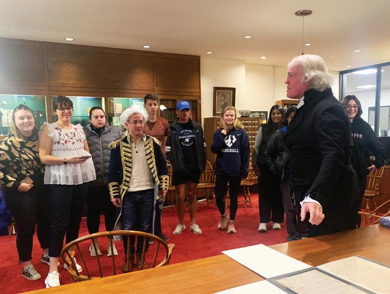 The cohort has featured several special guests. At the invitation of Brian Alexander, associate professor of politics, Special Collections welcomed Bill Barker, also known as “Thomas Jefferson,” for a costumed tour of important books in Jefferson’s life. Some readers may remember that Special Collections holds a copy of Jefferson’s “Manual of Parliamentary Practice” featuring annotations by Jefferson himself. In March 2024, the cohort sponsored a book talk by Stephanie Stillo, chief of the Rare Books and Special Collections Division at the Library of Congress and former