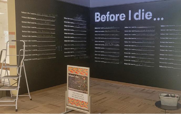 The Mudd Center for Ethics created a participatory exhibit in Leyburn titled “Candy Chang: Before I Die.” The exhibit ran from February to June of 2024. According to the Mudd Center’s website, Chang’s interactive work “reimagines how the walls of our public spaces can help us grapple with mortality and meaning as a community today. … Anyone walking by could pick up a piece of chalk, reflect on death and life and share their personal aspirations in public.” According to the artist’s website, there are “over 5,000 Before I Die walls in over 70 countries, including Iraq, China, Brazil, Kazakhstan and South Africa.”