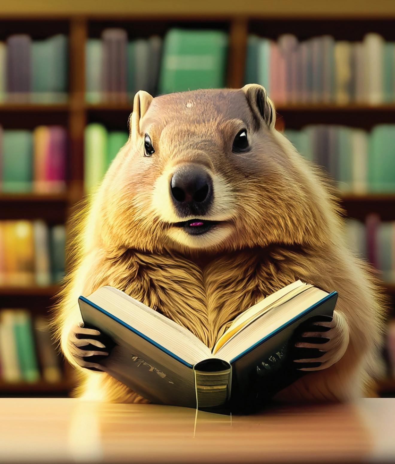 Where do you turn when your neighborhood varmint refuses to strike a pose for W&L's Groundhog Day email? Wendy Rains decided to give A.I. a whirl, generating an image by simply asking for a cartoon groundhog reading a book in the library. (Because when your furry friend is too busy avoiding the spotlight, why not just let technology do the heavy lifting?)