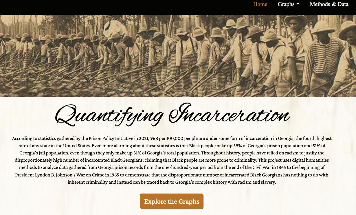 “Quantifying Incarceration” was a combined honors thesis project with Chalker's history major and law, justice, and society minor. The project analyzed data gathered from Georgia prison records from 1865 to 1965 to demonstrate that the disproportionate number of incarcerated Black Georgians has nothing to do with inherent criminality and instead can be traced back to Georgia's complex history with racism and slavery.