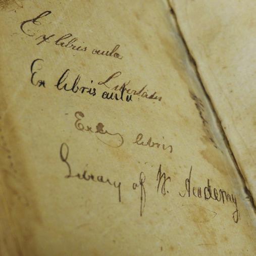ABOVE: A selection of surviving volumes of the original Liberty Hall Academy library purchased in or about 1776 by academy president William Graham. The volumes are housed in W&L Special Collections and Archives. LEFT: An original Latin inscription “ex libris aula libertatis” meaning “a book of/from Liberty Hall” from the endpapers of a surviving Liberty Hall Academy library volume. This Latin phrase is included in the majority of the surviving volumes.