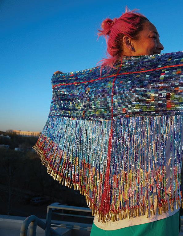 ERICA LORD HOLDS ALOFT ONE OF HER LOOM-WOVEN GLASS BEAD BURDEN BELTS, EXTENDING MORE THAN SIX FEET IN LENGTH. THE CREATION OF EACH BELT REQUIRES HUNDREDS OF HOURS OF METICULOUS WORK TO PRODUCE AN EXACT DUPLICATION OF THE GENETIC SEQUENCING IT REPRESENTS.