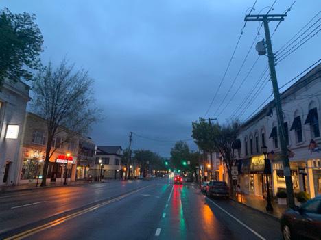 The center of Huntington, N.Y., on May 1. The usually a busy, traffic-filled main street is nearly empty and lines with closed shops.