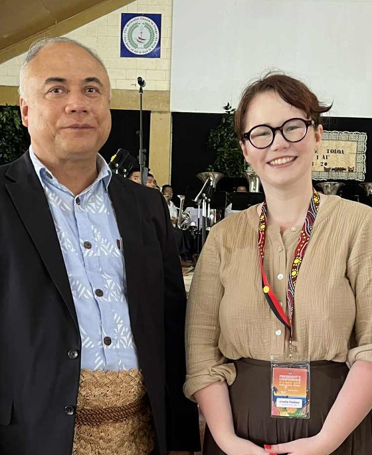Emelia Haskey met the Tongan Prime Minister, Dr ’Aisake Eke, at the Uniting Church’s Presidents Conference in Tonga last November. (Photograph: the Uniting Church.)