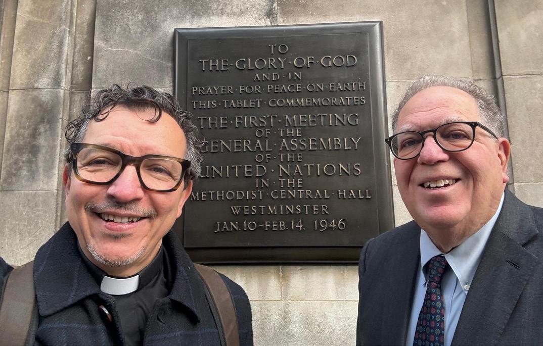 Rabbi Dr Frank Dabba-Smith and GS by the commemorative plaque of the very first UN Assembly that took place in January and February 1946.